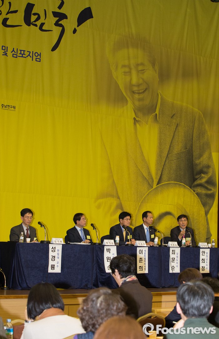 (세종=포커스뉴스) 29일 오후 세종시 정부세종컨벤션센터 국제회의장에서 열린 국가균형발전선언 12주년 기념행사 및 심포지움에 참석한 안희정 충남지사가 인사말을 하고 있다. 왼쪽부터 성경륭 한림대교수, 박원순 서울시장, 이춘희 세종시장, 최문순 강원지사, 안희정 충남지사.