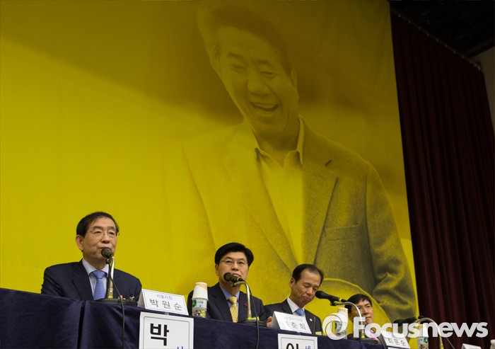 (세종=포커스뉴스) 29일 오후 세종시 정부세종컨벤션센터 국제회의장에서 열린 국가균형발전선언 12주년 기념행사 및 심포지움에 참석한 박원순 서울시장이 인사말을 하고 있다. 왼쪽부터 박원순 서울시장, 이춘희 세종시장, 최문순 강원지사, 안희정 충남지사.
