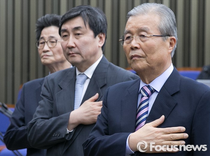 (서울=포커스뉴스) 김종인(오른쪽부터) 더불어민주당 비대위원장, 이종걸 원내대표, 이목희 정책위의장이 29일 오후 서울 여의도 국회에서 열린 의원총회에 참석해 국기에 대한 경례를 하고 있다.