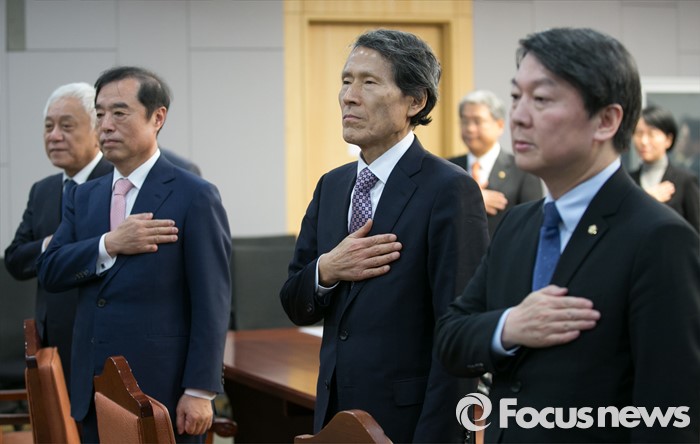 (서울=포커스뉴스) 29일 오후 서울 여의도 국회 의원회관에서 열린 '참여정부 시절 청와대 정책실장을 지낸 김병준 국민대 교수 초청 간담회, 한국정치 제3의 길을 말한다'에 참석한 안철수(오른쪽부터) 국민의당 인재영입위원장, 한상진 공동창당준비위원장, 김 교수, 김한길 상임부위원장이 국기에 대한 경례를 하고 있다.