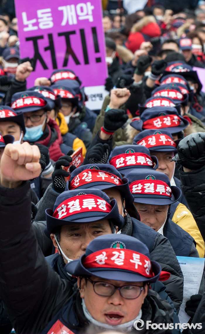 (서울=포커스뉴스) 29일 오후 서울역 광장에서 열린 '한국노총 전국 단위노조 대표자 총력투쟁 결의대회'에 참석한 조합원들이 정부가 발표한 양대 행정지침 폐기를 촉구하는 구호를 외치고 있다.