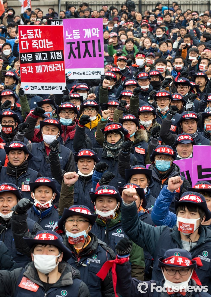 (서울=포커스뉴스) 29일 오후 서울역 광장에서 열린 '한국노총 전국 단위노조 대표자 총력투쟁 결의대회'에 참석한 조합원들이 정부가 발표한 양대 행정지침 폐기를 촉구하는 구호를 외치고 있다.