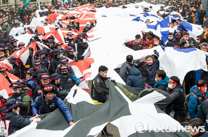 (서울=포커스뉴스) 29일 오후 서울역 광장에서 열린 '한국노총 전국 단위노조 대표자 총력투쟁 결의대회'에 참석한 조합원들이 정부가 발표한 양대 행정지침 폐기를 촉구하는 대형 현수막을 찢고 있다.