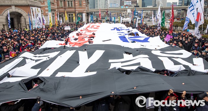 (서울=포커스뉴스) 29일 오후 서울역 광장에서 열린 '한국노총 전국 단위노조 대표자 총력투쟁 결의대회'에 참석한 조합원들이 정부가 발표한 양대 행정지침 폐기를 촉구하는 대형 현수막을 펼치고 있다.