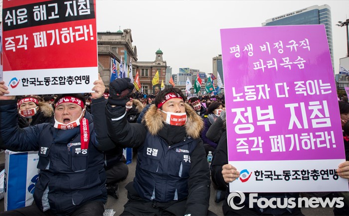 (서울=포커스뉴스) 29일 오후 서울역 광장에서 열린 '한국노총 전국 단위노조 대표자 총력투쟁 결의대회'에 참석한 조합원들이 정부가 발표한 양대 행정지침 폐기를 촉구하는 구호를 외치고 있다.
