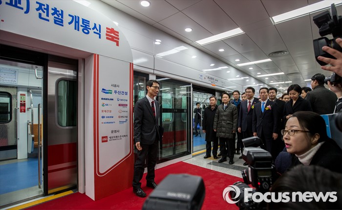 (수원=포커스뉴스) 강호인 국토교통부 장관과 남경필 경기도지사를 비롯한 주요내빈들이 29일 오후 경기도 수원시 영통구 신분당선 광교중앙역에서 열린 '정자-광교 복선전철 개통행사'를 마친 뒤 시승하기 위해 전철로 이동하고 있다.