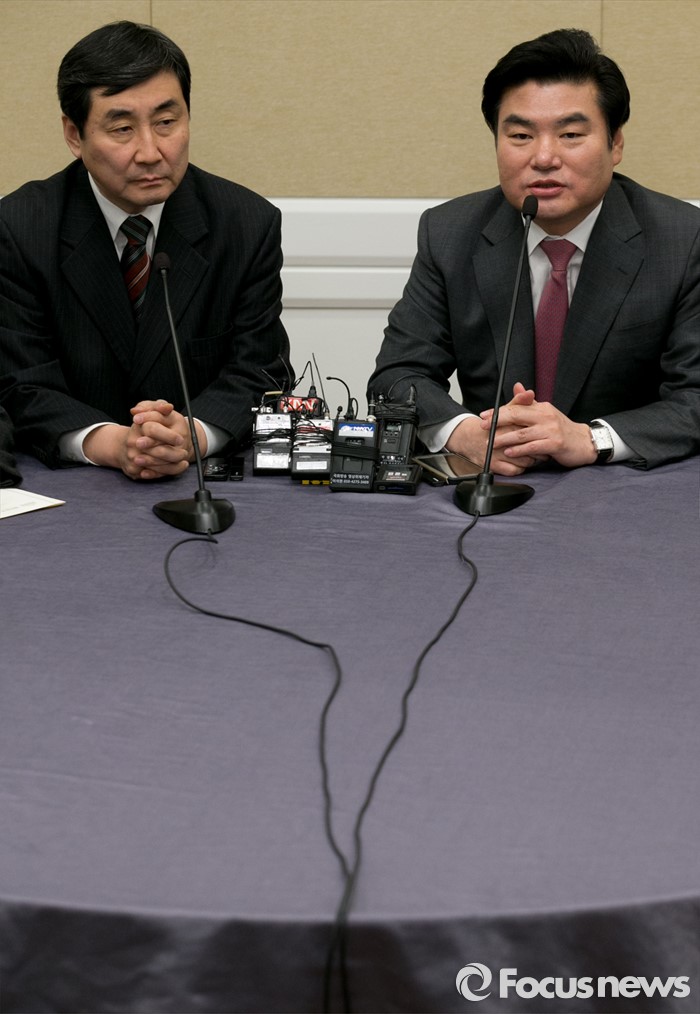 현재 새누리당 의원들은 의원총회를 마치고 본회의장으로 이동했지만, 더민주 의원들은 본회의 개최에 반대하고 있다11일 오전 서울 여의도 국회 귀빈식당에서 20대 총선 선거구 획정 기준 및 쟁점 법안 논의를 위해 진행된 여야 원내지도부 회동에 참석한 원유철(오른쪽) 새누리당 원내대표와 이종걸 더불어민주당 원내대표가 모두발언을 하고 있다. 2016.01.11 박동욱 기자