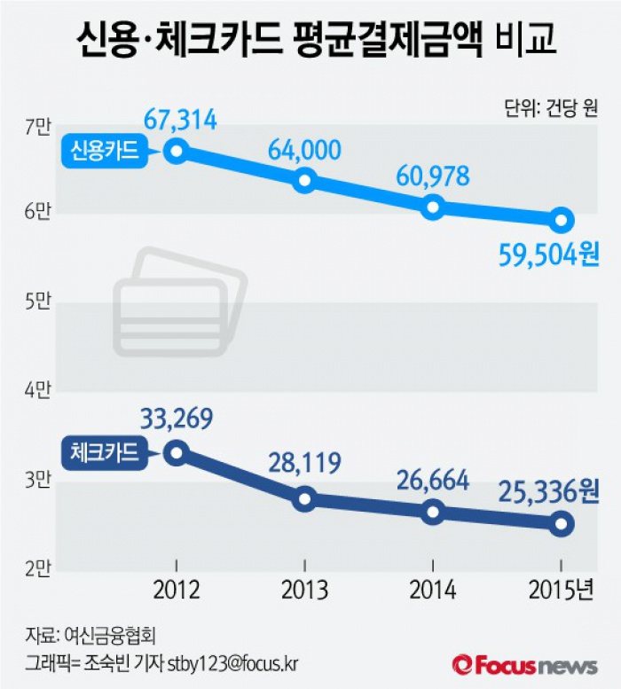 (서울=포커스뉴스) 29일 여신금융협회가 발표한 '2015년 카드승인실적' 보고서에 따르면 신용카드의 1건 당 평균결제금액이 사상 최초로 5만원대로 내려앉았다.
