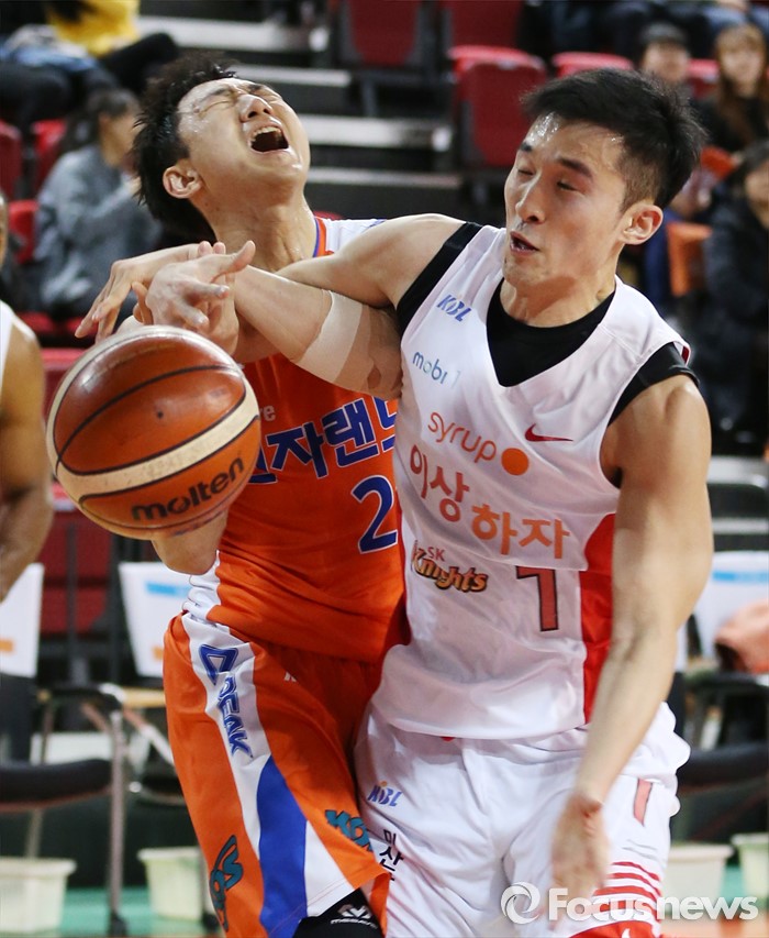 (인천=포커스뉴스) 29일 인천 삼산체육관에서 열린 2015-2016 프로농구 전자랜드-SK 경기에서 전자랜드 정영삼이 골밑 돌파를 시도하다 SK 변기훈의 수비에 막히며 볼을 놓치고 있다.