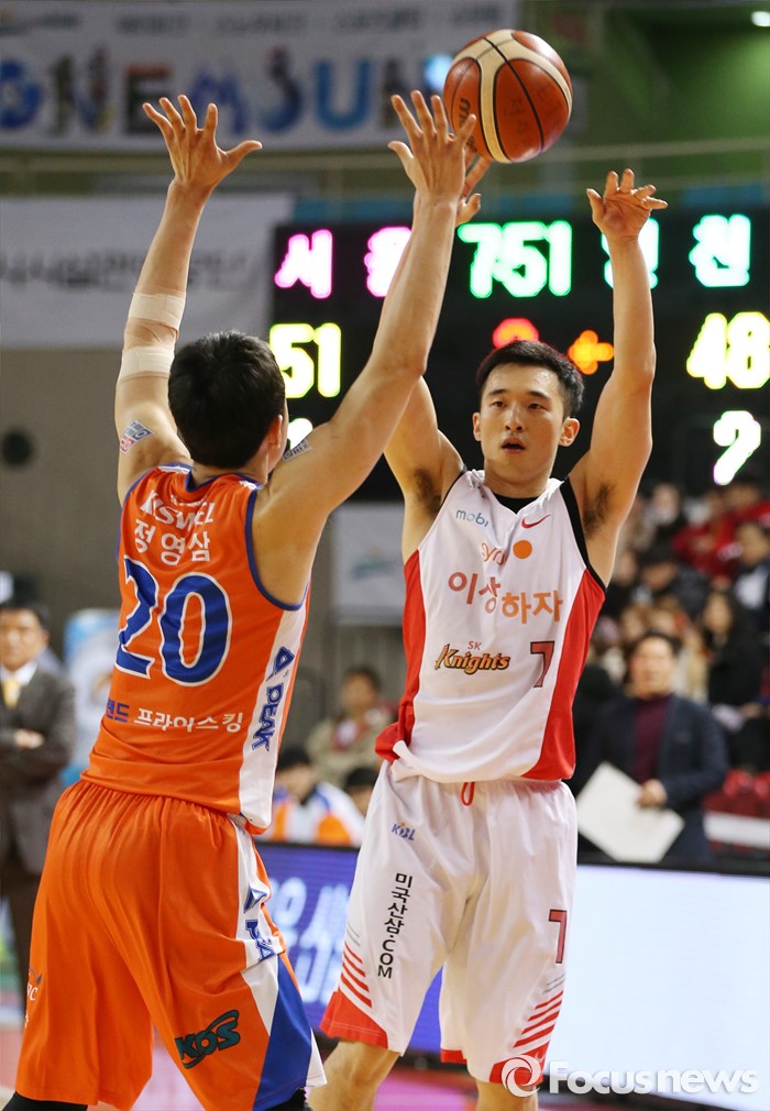 (인천=포커스뉴스) 29일 인천 삼산체육관에서 열린 2015-2016 프로농구 전자랜드-SK 경기에서 SK 변기훈이 전자랜드 정영삼의 마크 위로 패스를 시도하고 있다.