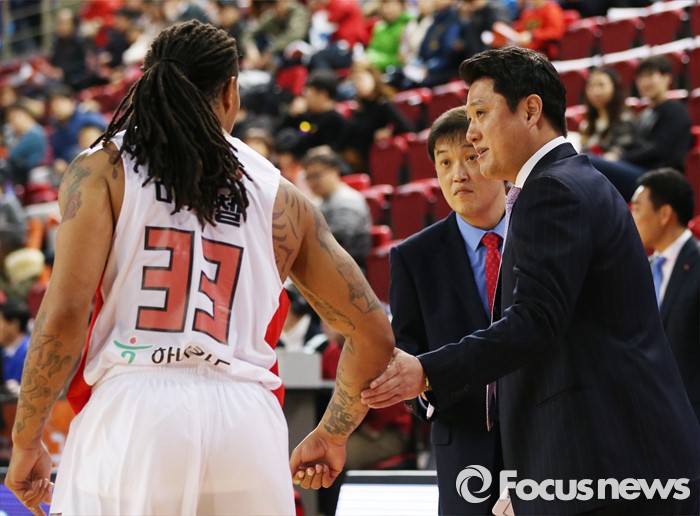 (인천=포커스뉴스) 29일 인천 삼산체육관에서 열린 2015-2016 프로농구 전자랜드-SK 경기에서 SK 문경은 감독이 경기중 미첼을 불러 작전을 지시하고 있다.