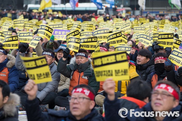 (서울=포커스뉴스) '민주노총 전국노동자대회'가 열린 30일 오후 서울광장에서 민주노총 조합원들이 정부의 '일반 해고'와 '취업규칙 변경' 양대 지침 철회와 노동개악 중단을 촉구하고 있다.