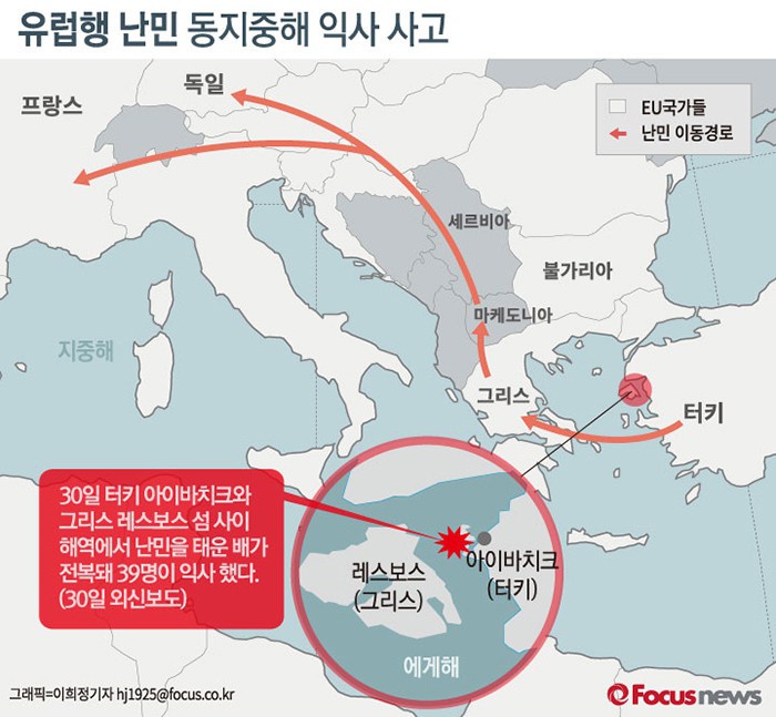 (서울=포커스뉴스) 터키에서 그리스로 향하던 난민선이 침몰해 최소 39명이 사망했다.