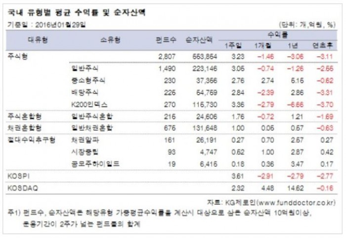 31일 펀드평가사 KG제로인이 지난 29일 공시된 기준 가격으로 펀드 수익률을 조사한 결과, 전체 국내주식형펀드는 한 주간 3.23% 상승했다.