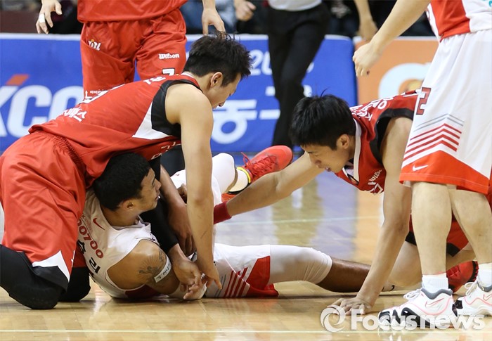 (안양=포커스뉴스) 31일 안양실내체육관에서 열린 2015-2016 프로농구 KGC-SK 경기에서 KGC 이정현과 양희종이 넘이진 SK 박승리의 볼을 가로채려 달려들고 있다.