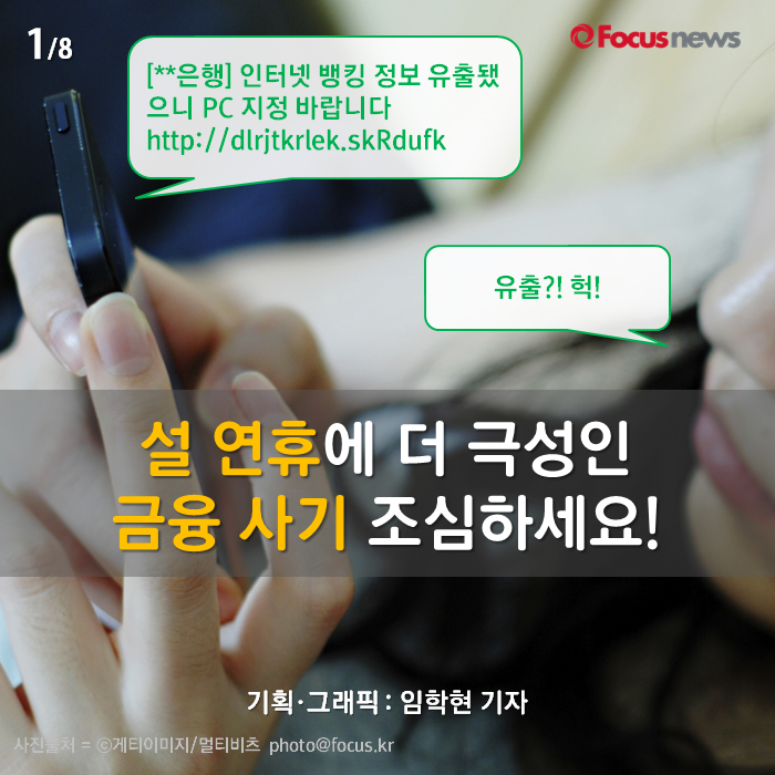 (서울=포커스뉴스) 설날에 고향에 내려가 있는데 '집에 택배가 도착했다'는 내용의 문자 메시지를 받으면 당황하게 됩니다. 그러다 보면 메시지 속의 링크를 누르는 경우가 있는데요. 절대 그러시면 안 됩니다. 스미싱 사기일 가능성이 크기 때문이죠. 택배 메시지를 가장하는 것 외에도 금융기관이나 공공기관을 사칭하는 경우도 있습니다. 카드뉴스로 주의해야 할 것들을 잘 살펴보세요. 사기꾼들은 설날이라고 쉬지 않습니다.