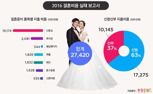 (서울=포커스뉴스) 대한민국 신혼부부의 평균 결혼 비용이 지난해보다 15%이상 증가한 2억7420만원에 달하는 것으로 나타났다.