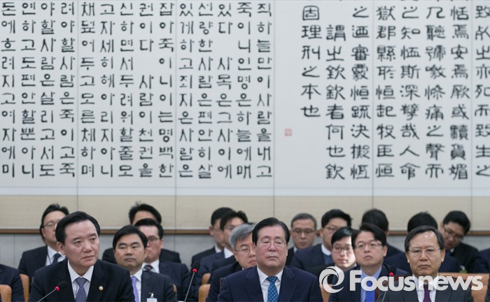 (서울=포커스뉴스) 1일 오전 서울 여의도 국회에서 열린 법제사법위원회 전체회의에 참석한 김현웅(왼쪽부터) 법무부 장관, 황찬현 감사원장, 박병대 법원행정처장이 의원들의 질의를 듣고 있다. 이날 법사위는 외국로펌과 국내 로펌이 합작법무법인을 설립할 수 있도록 허용하는 내용의 외국법자문사법 개정안을 의결했다.