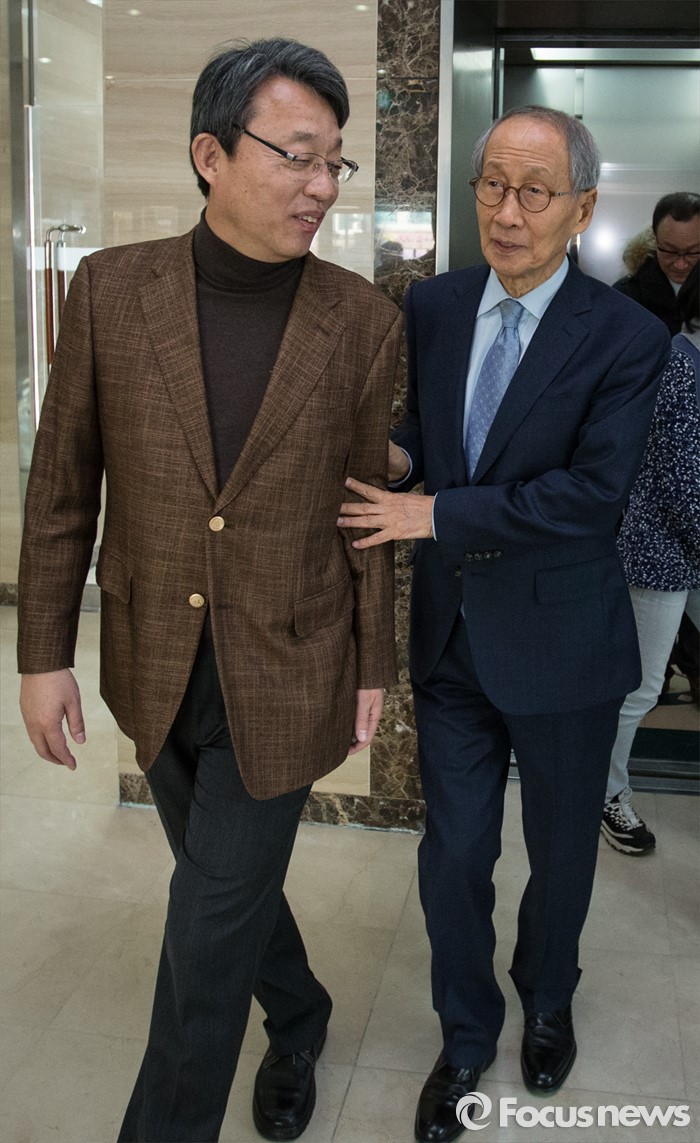(서울=포커스뉴스) 국민의당 윤여준 공동창당준비위원장이 김성식 전 의원의 배웅을 받으며 1일 오전 서울 마포구 국민의당 당사를 빠져나오고 있다. 윤 위원장은 국민의당의 창당 준비작업이 거의 마무리 된 것으로 보인다며 건강상의 이유로 당분간 요양을 할 계획이라고 밝혔다.