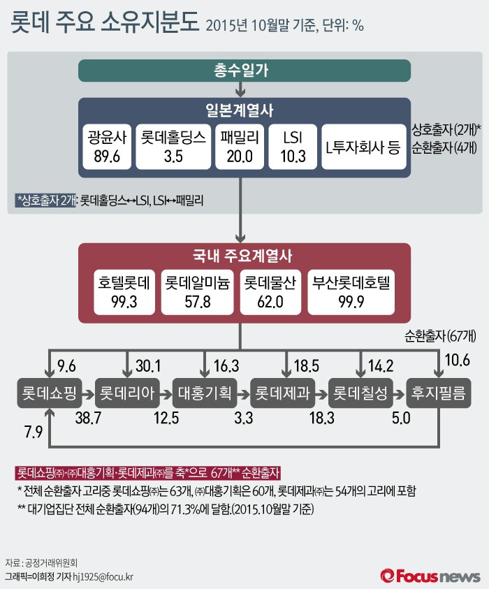 (서울=포커스뉴스) 공정거래위원회는 지난해 10월 롯데에서 제출한 자료를 분석해, 롯데의 해외계열사 소유현황 등을 1일 공개했다. 롯데는 여전히 국내 대기업 가운데 가장 많은 순환출자 고리를 가지고 있는데다, 신격호 롯데 총괄회장 등 총수 일가가 일본 계열사를 통해 국내 계열사를 지배하고 있는 것으로 나타났다.