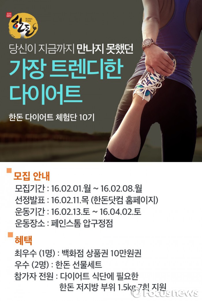 (서울=포커스뉴스) 한돈자조금관리위원회는 한돈닷컴의 체험단 페이지를 통해 오는 8일까지 ‘한돈 다이어트 체험단 10기’를 모집한다. 응모자 중 총 12명을 선발해 11일 홈페이지에서 공개한다.