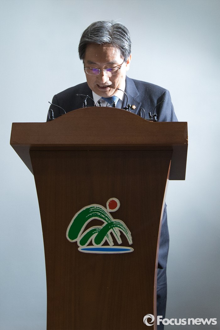(청주=포커스뉴스) 노영민 더불어민주당 의원이 1일 오후 충북 청주 충북도청 기자실에서 4.13 총선 불출마 선언 기자회견을 하고 있다.