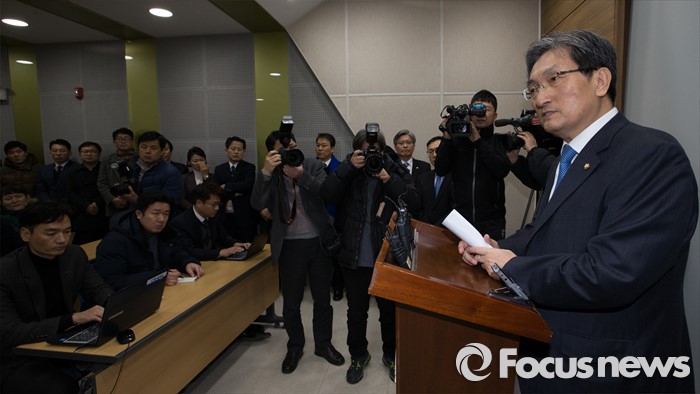 (청주=포커스뉴스) 노영민 더불어민주당 의원이 1일 오후 충북 청주 충북도청 기자실에서 4.13 총선 불출마 선언 기자회견을 하고 있다.