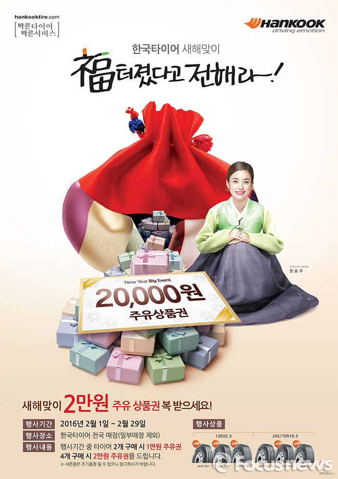 이번 행사는 트럭∙버스 운전자들의 유류비 부담을 덜어주기 위해 기획됐다. 한국타이어 트럭버스 전문매장 'TBX'와 한국타이어 공식 대리점에서 행사 대상 타이어를 2개 이상 구매한 고객에게 1만원, 4개 이상 구매한 고객에게는 2만원 상당의 주유 상품권을 증정한다.한국타이어의 새해 맞이 주유 상품권 증정 행사 포스터 <사진제공=한국타이어> 2016.2.2. 김현이 인턴기자