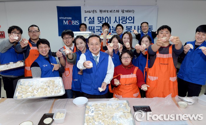 장윤경 현대모비스 홍보실장(상무)는 “소외이웃을 돕기 위한 사내 임직원들의 자발적 참여가 해를 거듭할수록 늘어나는 것을 뜻 깊게 생각하고 있다”며 “사회취약계층에 대한 관심과 지원이 사회 전반으로도 확대되길 바란다”고 전했다.현대모비스 임직원들이 2일 종로장애인복지관을 찾아 장애인 가정에 전달할 만두를 빚고 기념사진을 촬영하고 있다. <사진제공=현대모비스>