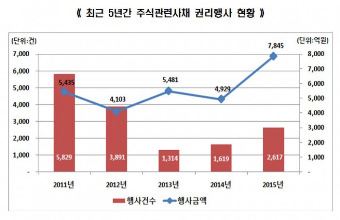 권리행사 종목은 총 118종목으로 전년(57종목) 보다 107% 증가했고, 행사 건수는 2617건으로 전년(1619건) 대비 61.6% 늘어났다.