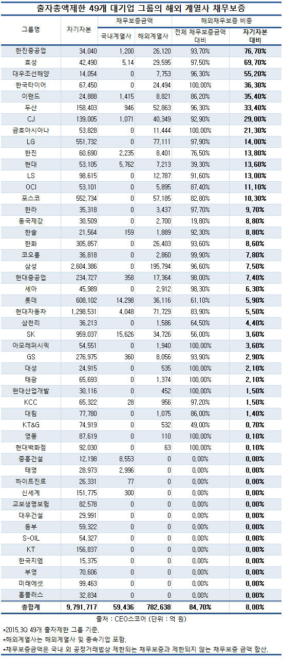 그러나 최근 불투명한 해외 지배구조에 대한 논란이 커지자 지난달 31일 발표한 '2016년 업무계획'에서 올해부터는 해외계열사에 대해서도 현황 공시의무를 부과키로 했다.출자총액제한 49개 대기업 그룹의 해외 계열사 채무보증.<자료제공=CEO스코어>