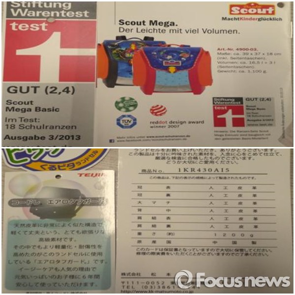서울YWCA 관계자는 “제품 품질은 대체로 우수하였으나, 일부 제품에 사용된 부속 자재의 유해물질 함유량이 어린이제품 안전기준을 크게 벗어나 안전성 강화를 위한 다각적 노력이 요구된다”며 “수입브랜드 제품은 품질 표시와 안전성에 대한 체계적인 관리 감독이 필요하다”고 말했다.일부 수입브랜드인 스카우트슐란젤(사진 위)은 섬유의 조성 또는 혼용률, 제조연월, 취급주의 사항, KC 마크 표기사항을, 쿨비타 란도셀 제품(사진 아래)은 취급주의 사항, KC 마크표기 사항을 누락하고 있는 것으로 나타났다.<사진제공=서울YWCA> 2016.2.3. 조윤성 기자