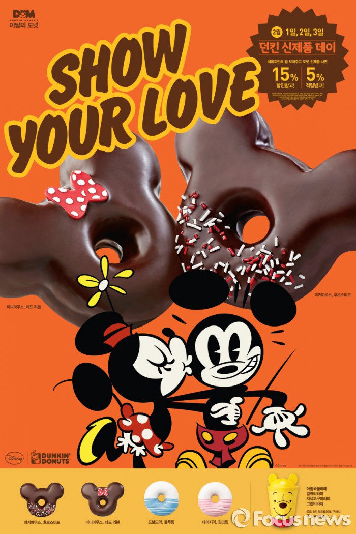 (서울=포커스뉴스) 던킨도너츠는 2월 이달의 도넛(DOM; Donut of the Month)으로 디즈니 캐릭터 미키마우스와 미니마우스, 도날드 덕과 데이지 덕을 표현한 도넛 4종을 출시했다.