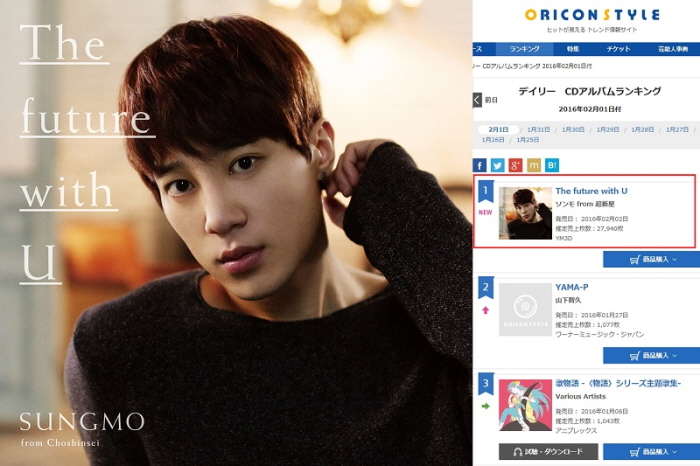 한편 초신성은 오는 2월 24일 열아홉 번째 싱글 ‘마타기미토(Mata Kimito)’를 발매하고 26, 27 양일간 일본 도쿄 요요기 국립 경기장 제1체육관에서 팬미팅을 개최할 예정이다.그룹 초신성 멤버 성모가 일본 솔로앨범 ‘더 퓨쳐 위드 유(The Future with U)’로 오리콘 일간 차트 1위에 올랐다. 사진은 앨범 재킷(좌)과 오리콘차트 온라인 페이지. <사진출처=마루기획/일본 오리콘차트 온라인 페이지 캡처>