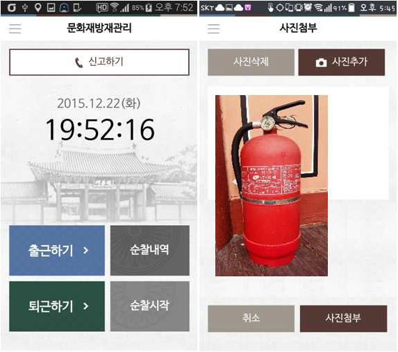 이 경우 현장에 설치된 자동화재속보설비를 통해 소방서에 자동연락이 되도록 시스템이 구축되어 있다. 하지만 문화재 소유자‧관리자, 관계 공무원에게는 별도로 일일이 유선으로 연락해야하며 평상시 안전관리상태에 대한 정보수집이 어려운 애로사항이 있었다.안전경비원 순찰기록관리 화면(왼쪽)과 안전점검 지적사항 단말기 화면.<사진제공=문화재청>