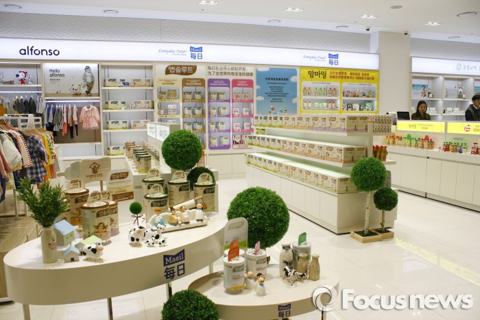 매일유업 SM면세점 팝업스토어는 고객들의 발길이 잦은 1층에 자리하고 있다. 매일유업의 분유 제품들과 영유아동복 브랜드 '제로투세븐'의 의류·화장품 등을 만나볼 수 있다.