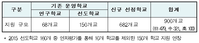 새롭게 추가되는 682개 학교는 지난해와 달리 각 시․도 교육청이 자체 공모를 통해 선정할 예정이다. 또 시·도교육청은 교육청 단위의 지원체계를 구축해 선도학교의 관리를 담당하며, 상반기 중간보고회와 연말 최종 성과평가를 통해 지역별 우수사례를 발굴한다.