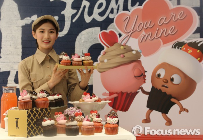 밸런타인데이 머핀은 애니메이션 제작사 몬스터 스튜디오와 협업한 브레드이발소 캐릭터를 컵케이크로 표현하고, 하트 장식을 더해 사랑에 빠진 느낌을 나타냈다.