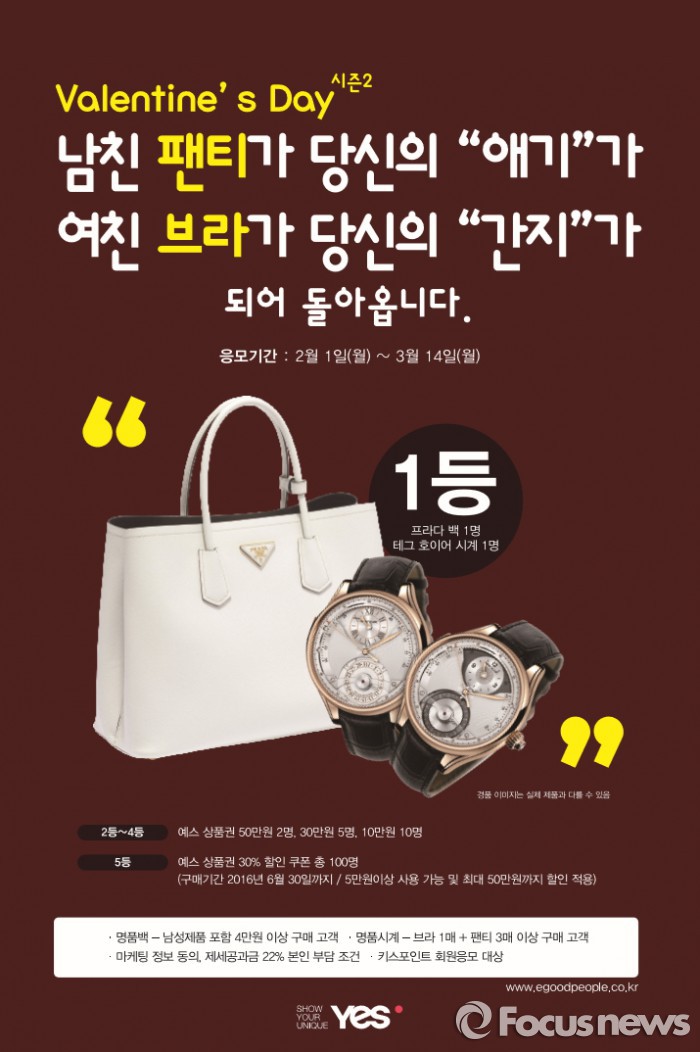 김대현 좋은사람들 마케팅팀 과장은 “이번 이벤트는 20대를 위한 국내 대표 언더웨어 브랜드로 사랑을 받아온 예스가 특별한 밸런타인데이 선물을 준비하는 고객을 위해 마련한 행사”라며 “3월14일까지 화이트데이 선물을 미리 준비하는 남성 고객에게도 알찬 구매 기회가 되기를 바란다”고 말했다.밸런타인데이 명품 이벤트 시즌2 포스터. <사진제공=예스>