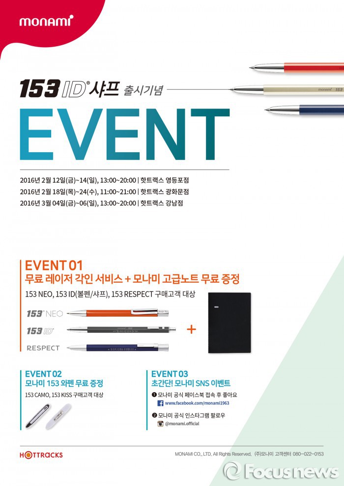 프로모션 기간 동안 모나미 소셜네트워크서비스(SNS) 이벤트도 열린다. 모나미 공식 페이스북 페이지 또는 인스타그램 계정(@monami_official)을 팔로우하고 현장에서 인증하면 153 카모와 키스 제품 중 1자루를 증정한다.모나미 신학기 프로모션 포스터. <사진제공=모나미>