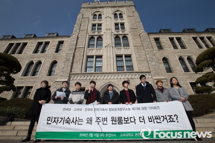 이어 “많은 대학들이 민간자본을 유치해 값비싼 기숙사를 지어놓고 그 부담을 학생들에게 전가하고 있다”며 “우리는 학교돈으로 지어서 비싼 임대료를 지불할 필요가 없는 기숙사가 필요하다”고 목소리를 높였다.11일 오전 서울 성북구 고려대 본관 앞에서 연세대·고려대·건국대 총학생회 학생들과 참여연대, 민달팽이유니온, 반값등록금 국민본부 등 회원들이 대학가 민자기숙사의 주요 운용현황에 대한 정보공개청구 공익소송을 제기하는 기자회견을 열고 있다. 2016.02.11 허란 기자