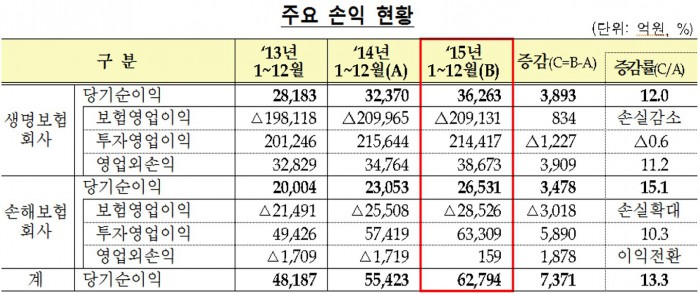 12일 금융감독원이 발표한 '2015년 보험회사 경영실적(잠정)'에 따르면지난해 보험사의 당기순이익은 6조3000억원으로 전년(5조5000억원)보다 13.3%(8000억원) 증가했다.
