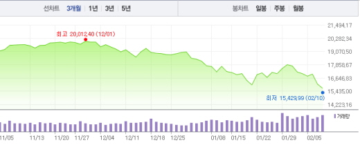 일본 니케이225지수는 지난 9일 5.4% 급락에 이어 10일에도 2.3% 넘게 떨어지면서 1만6000선 아래로 떨어진 상태다.일본 니케이225지수<사진제공=네이버 캡쳐>