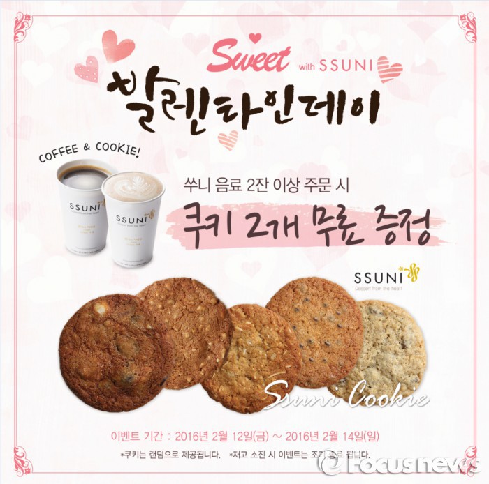 (서울=포커스뉴스) JH그룹의 디저트 카페 ‘쑤니’는 밸런타인데이를 기념해 ‘쿠키 무료 증정 이벤트’를 오는 14일까지 진행한다.