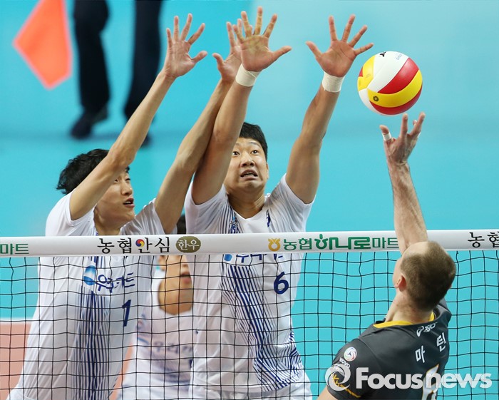 우리카드는 외국인선수 알렉산더가 서브득점으로만 6득점하는 등 23득점으로 공격을 주도했다. 박상하는 블로킹 4득점 포함, 8득점으로 힘을 냈다. 박진우와 김광국(이상 블로킹 3득점) 등도 KB손해보험에 '높이' 우위를 선보였다. 우리카드는 서브로 10득점, 블로킹으로 14득점하며 손쉽게 경기를 풀어갔다. 반면 KB손해보험은 서브와 블로킹이 각각 5득점과 6득점으로 우리카드에 크게 뒤졌다. 김요한이 14득점했지만 마틴(6득점)의 부진에 공격에 힘이 실리지 않았다.(서울=포커스뉴스) 24일 장충체육관에서 열린 '2015-2016NH농협 V-리그' 남자부 우리카드-KB손해보험 경기에서 우리카드 박진우(1)와 나경복이 KB손해보험 마틴의 연타 공격에 블로킹을 대고 있다. 2015.11.24 우정식 기자
