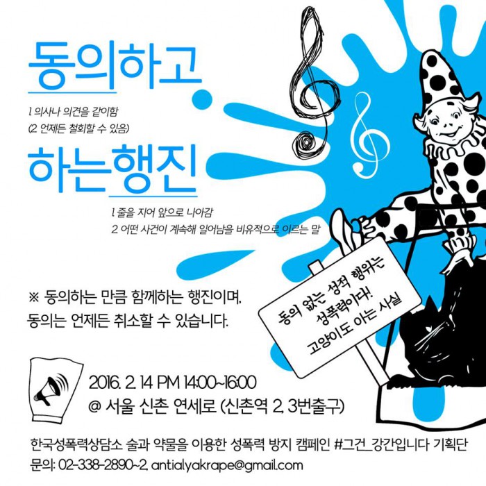 또 “폭력은 정확한 이름으로 지칭해야 한다”며 “동의를 구하지 않은 성관계는 폭력적인 성관계라고 부르는 것이 아니라 강간이다”고 목소리를 높였다.<사진출처='동의하고 하는 행진' 페이스북>14일 오후 2시쯤 서울 지하철 신촌역 인근에서 '한국성폭력상담소 술과 약물을 이용한 성폭력 방지 캠페인 #그건_강간입니다 기획단' 주최로 열린 '동의하지 않은 상태에서 이뤄지는 성적행위를 규탄하는 행진'에서 참석자들이 손피켓을 들고 있다. 2016.02.14 박요돈기자 smarf0417@focus.co.kr