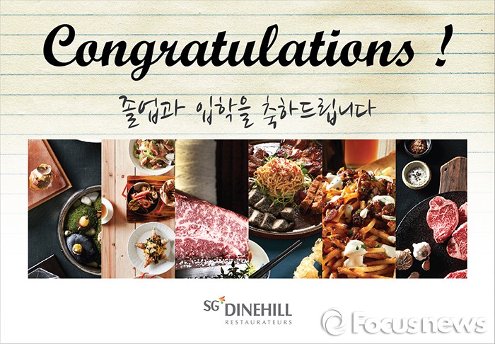 쿠폰북은 SG다인힐의 △이탈리안 '블루밍가든' △스테이크하우스 '붓처스컷' △수제버거 '패티패티' △숙성등심 전문점 '투뿔등심' △ 피자와 그릴 요리점 '핏제리아' △ 중식 'Mazing.A' 등 11개 브랜드 매장에서 받을 수 있다. 매장을 방문하여 3만원 이상 구매한 고객들에게 선착순으로 배포되며 쿠폰은 내달 31일까지 사용 가능하다.졸업과 입학 시즌을 축하 프로모션 포스터. <사진제공=SG다인힐>