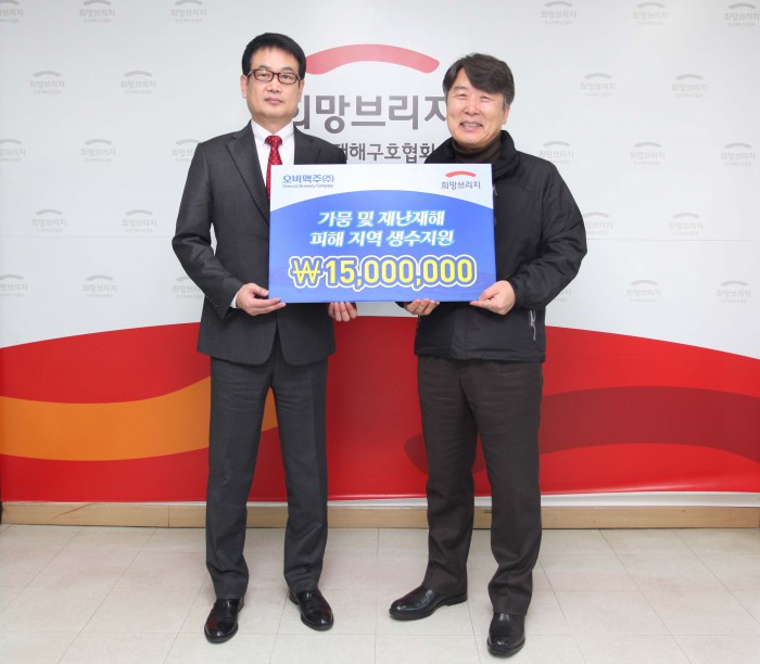 오비맥주 관계자는 "이번 기부를 통해 유사시 재난 피해를 입은 지역민들에게 실질적인 도움을 드릴 수 있게 돼 기쁘다"며 "환경보전을 핵심 경영이념으로 삼고 있는 기업으로서 물 부족 현상을 포함한 환경문제 해결과 지역사회 발전을 위해 더욱 노력하겠다"고 말했다.