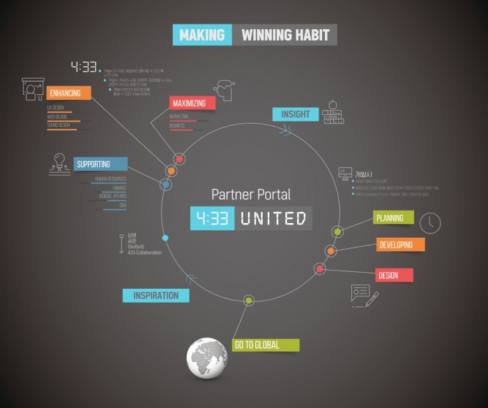 소태환 네시삼십삼분 대표는 "영웅 for Kakao, 블레이드 for Kakao 등 1위 게임을 서비스 한 경험과 노하우를 살려 18종에 이르는 출시 예정 게임들이 시장에서 이용자들에게 사랑 받고 성과를 낼 수 있도록 잘 협업해 개발하겠다"며, "다양한 라인업이 갖춰진 만큼 국내는 물론이고 글로벌 시장 진출도 적극적으로 진행해 글로벌 성공사례를 만들어 나갈 것"이라고 밝혔다.4:33 유나이티드 <사진제공=네시삼십삼분>