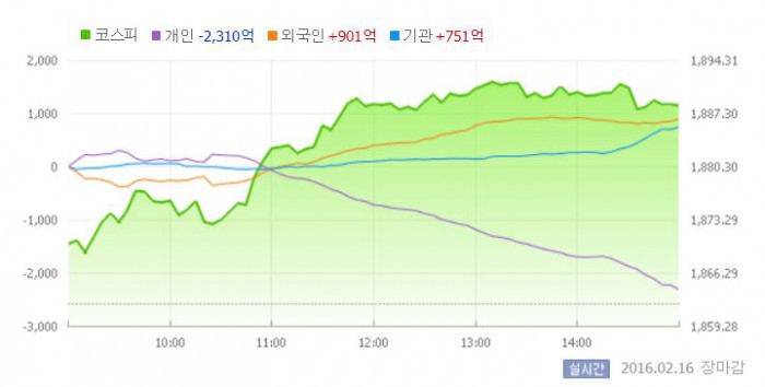 16일 코스피지수는 전일 대비 1.40%(26.10포인트) 오른 1888.30에 장을 마쳤다. 코스닥지수는 전날 보다 2.19%(13.58포인트) 상승한 634.95에 마감했다.
